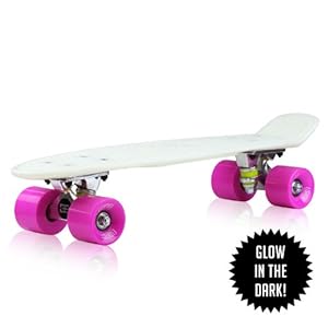 3" Wide aluminum trucks 59mm 78a Urethane-cored super smooth EightBit wheels ABEC-7 High speed precision stainless steel bearings Board includes a high-tensile allen key 6" x 22" Retro-style waffle-grip PLASTIC deck - Glow-in-the-Dark!